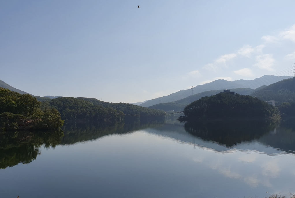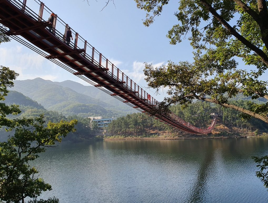 다리 위에 서면 살짝 흔들리는 느낌과 함께 발밑으로 불어오는 바람이 등골을 간질입니다. 처음에는 약간 긴장했지만, 곧 고개를 들어 주변을 둘러보니 가을빛으로 물든 산과 들판이 한눈에 들어왔습니다. 특히 다리 중간에서 바라본 호수의 물빛과 가을로 변해가는 산들의 풍경은 사진으로 다 담기 어려울 만큼 아름다웠습니다.